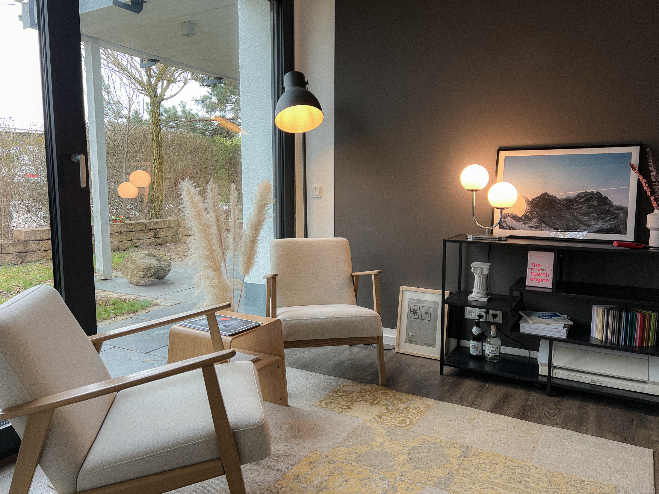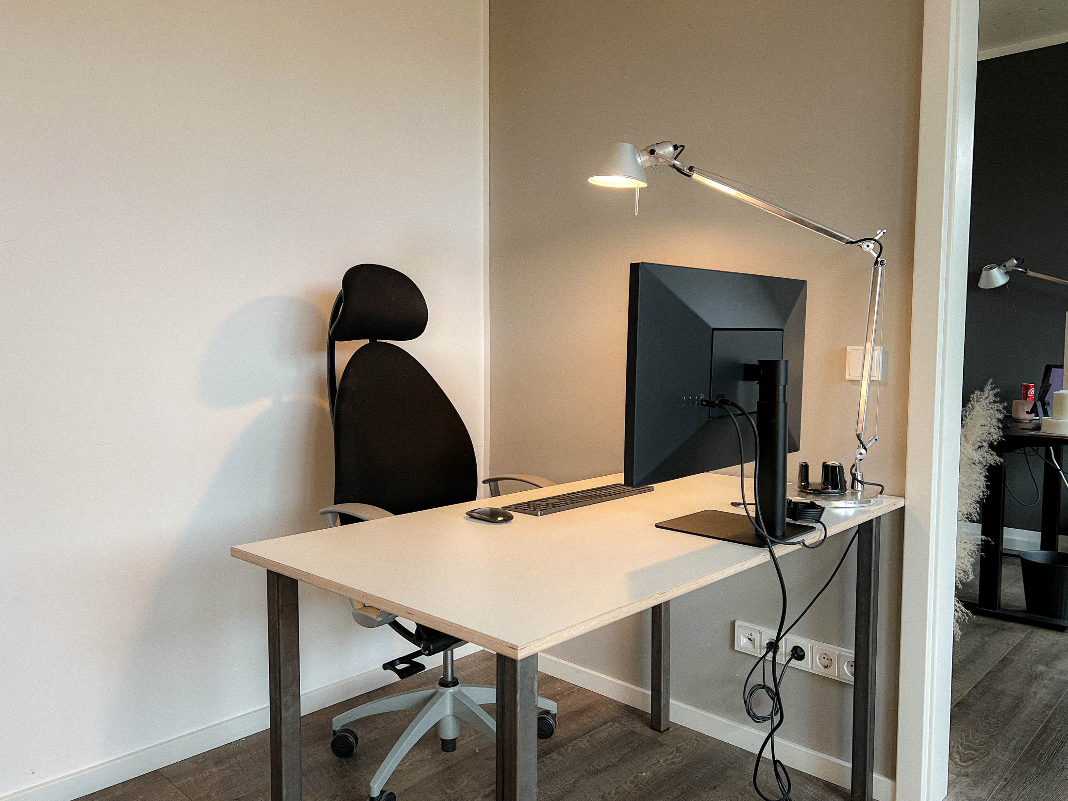 Im Raum Südblick erhältst du einen hellen Arbeitsplatz an einem Holztisch mit den Abmessungen 130 cm x 70 cm inklusive 27″ 5K-Display mit USB-C Anschluss. Außerdem einen schönen Blick in den Garten. Zwei gemütliche Stühle runden den Raum ab – perfekt für kurze Pausen oder einen Perspektivenwechsel.